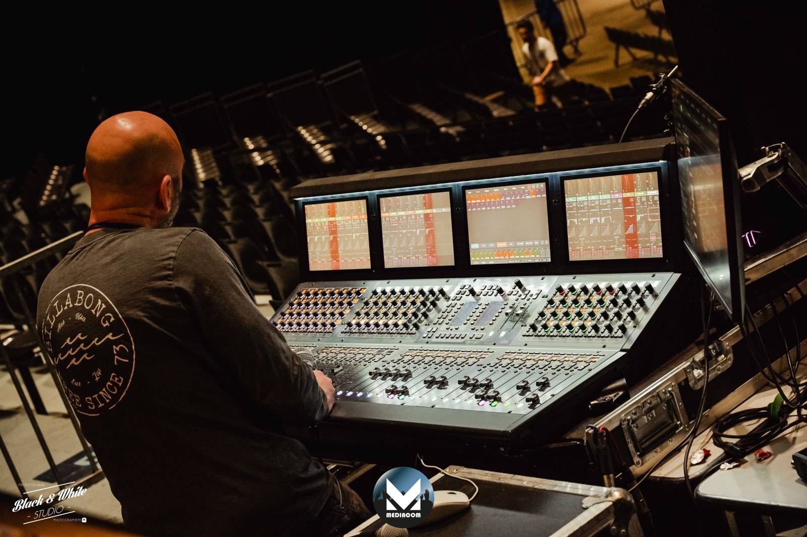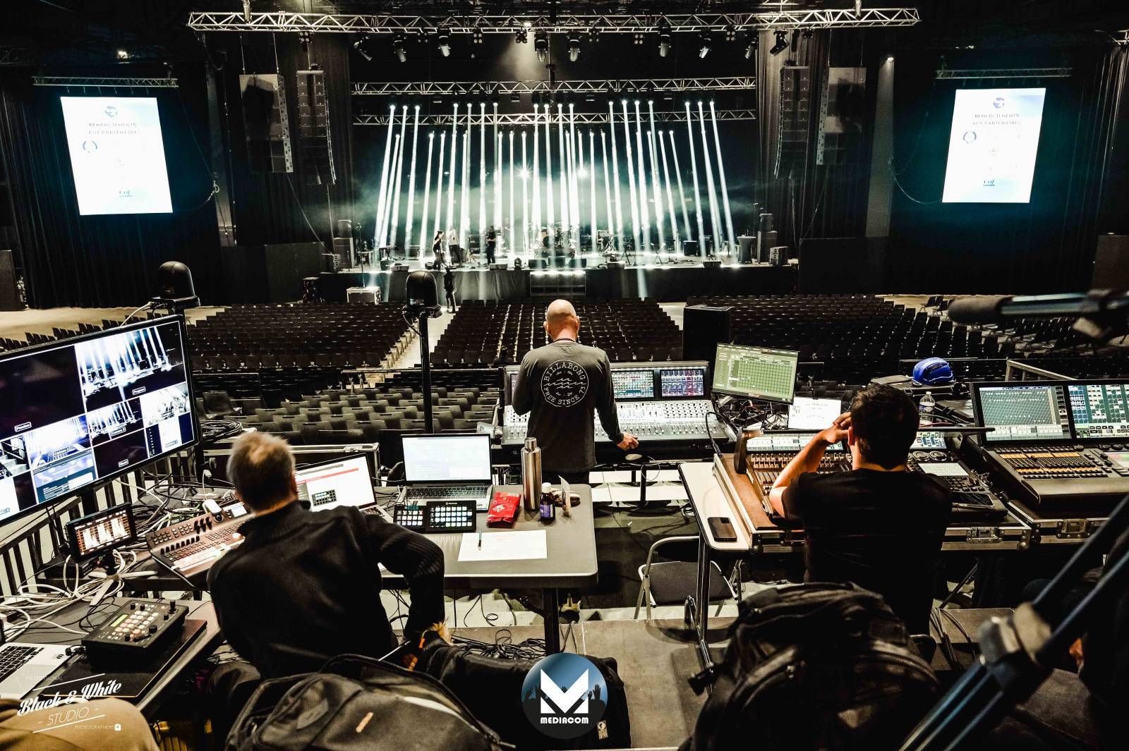 - 1 console de mixage numérique AVID 6L32 et une vingtaine de liaisons ear monitor et HF en SHURE PSM 1000 et Axient Digital.