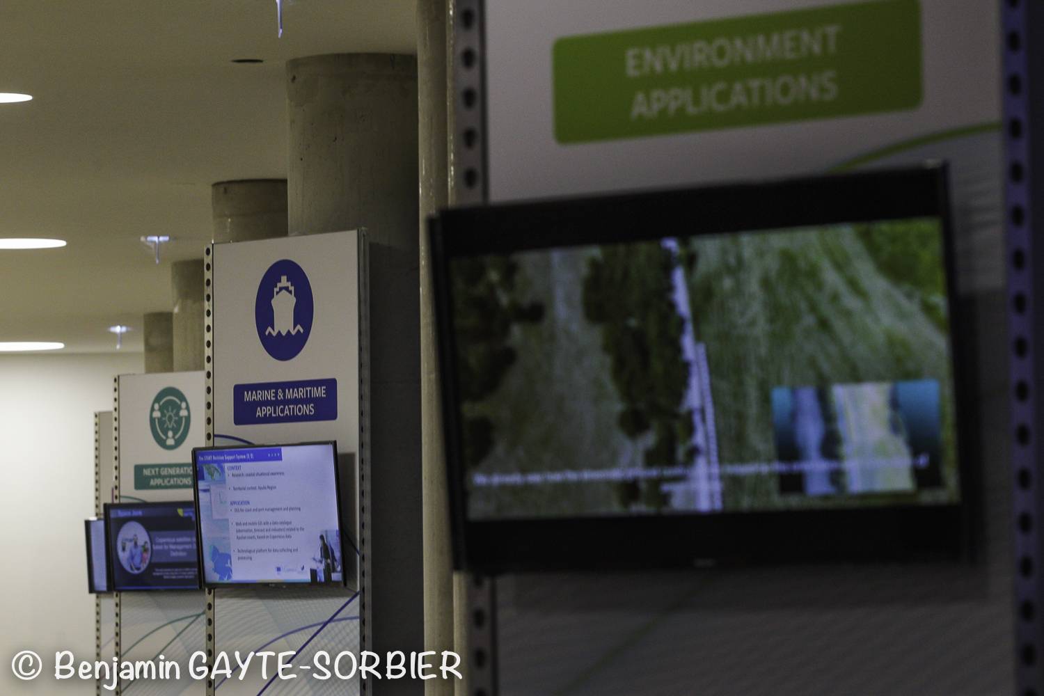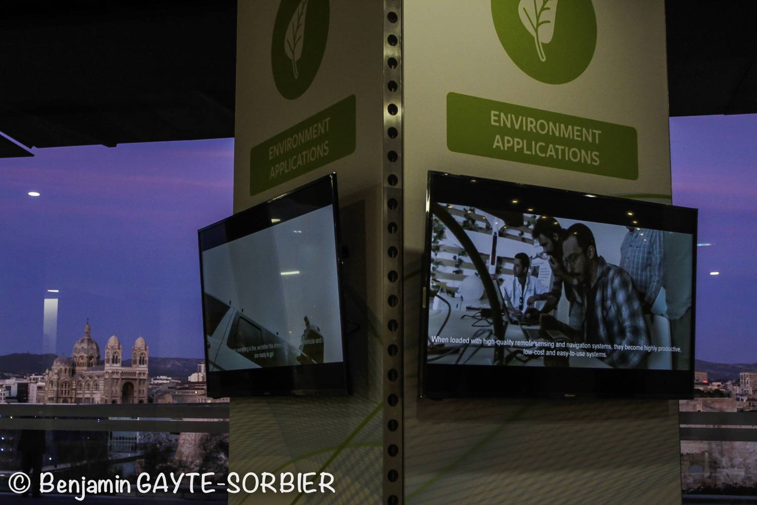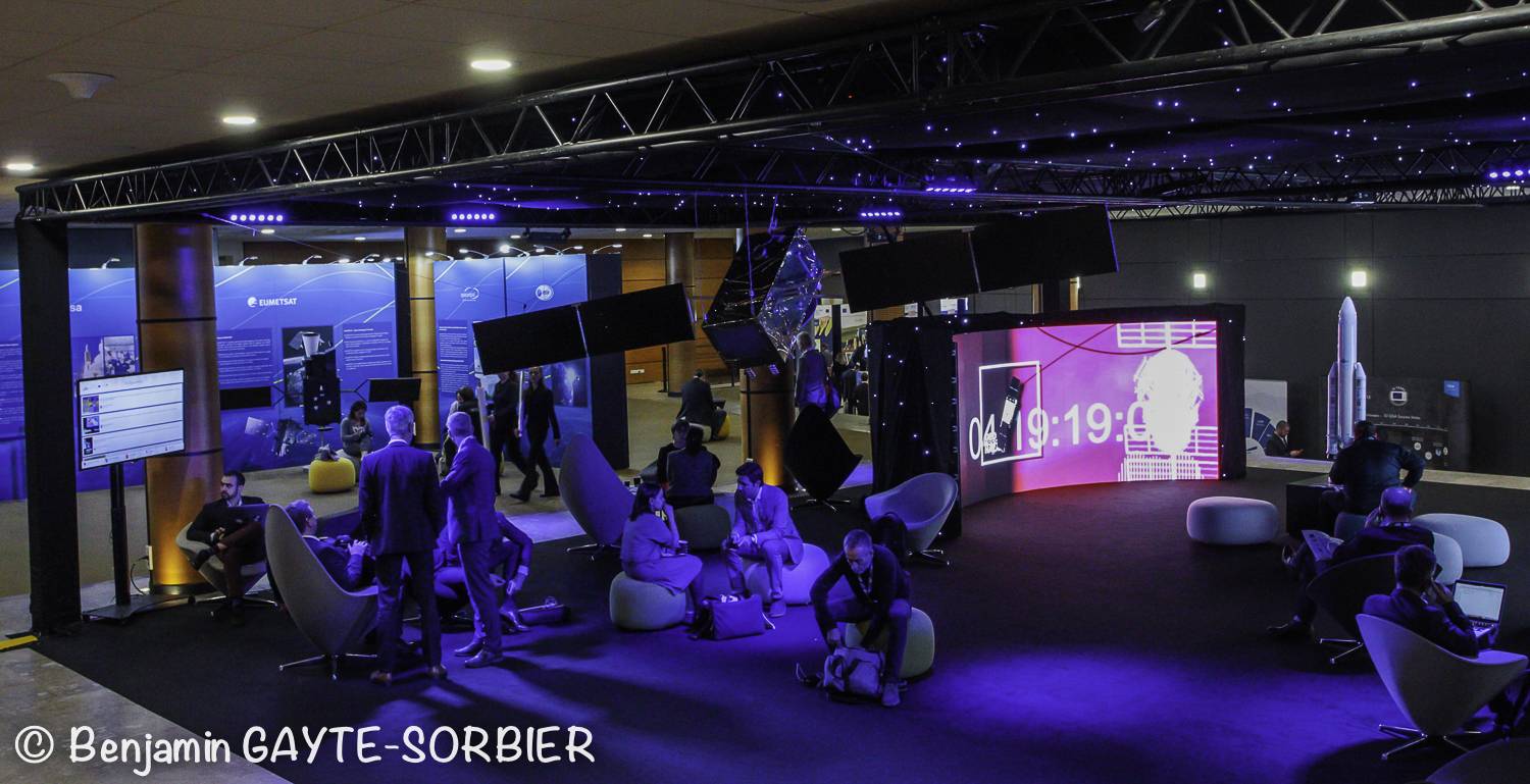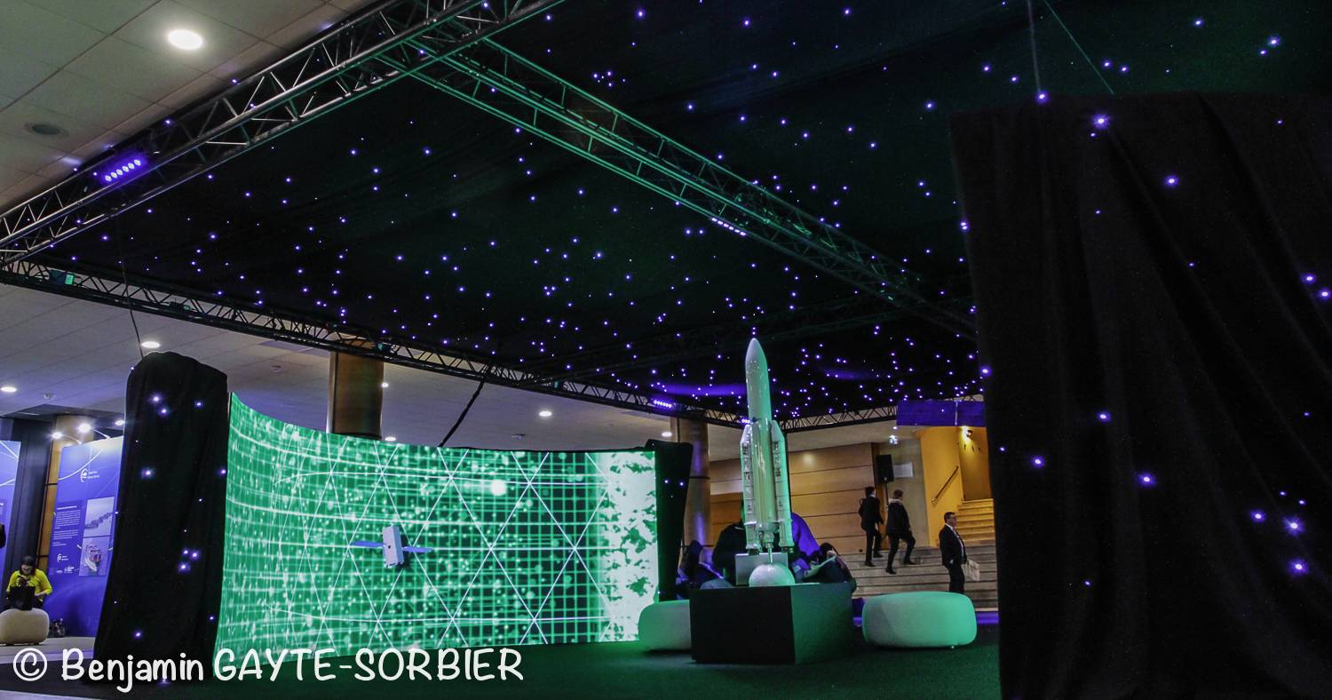 En effet, notre équipe composée de 8 techniciens, a mis en place un grand nombre d’écrans led 4k (26 écrans de différentes tailles du 32 au 75 pouces) dans l’ensemble des espaces de réception et auditorium du Palais du Pharo, mais également un grill scénique de 13m par 11m et 3.5m de haut créant un espace de rencontre cosy et mis en lumière mettant en avant les nouvelles technologies de l’espace.
