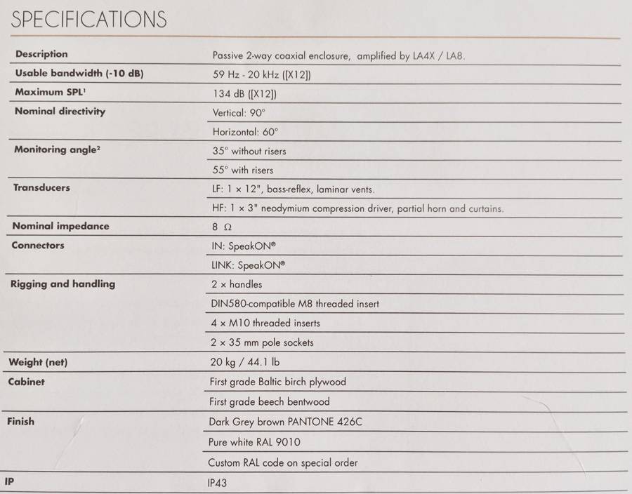 La bande passante de l’enceinte s’étend de 59Hz à 20kHz, générant par là-même une directivité H x V de 60° x 90°. Le SPL maximum est de 136 dB. Les dimensions de l’enceinte X12 sont de 496mm de hauteur, 430mm en largeur par 375mm en profondeur. Enfin le poids de l’enceinte ne fait que 20kg.