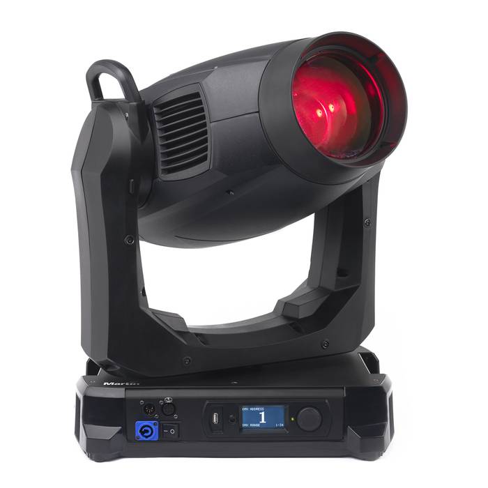 Cette lyre à effets de MARTIN est dotée d’une lampe OSRAM HTI 6000°k de 1000W, avec un zoom linéaire motorisé de 10° à 44°, un système de mixage des couleurs CMY + CTO, et un grand nombre de roues (une de 8 couleurs + blanc, une de 5 gobos rotatifs indexables, une de 5 gobos fixes et une de 5 effets volumétriques).