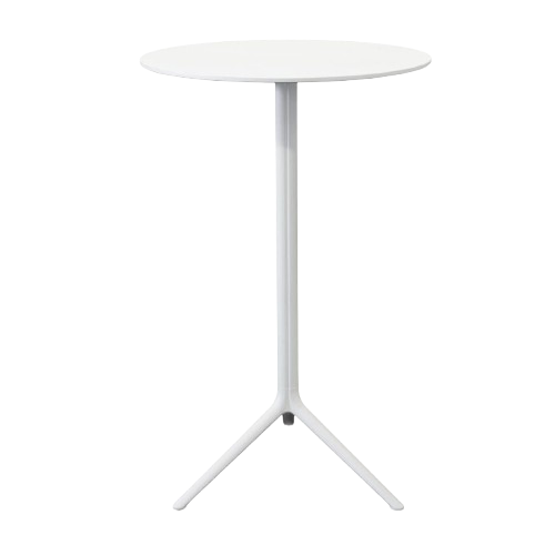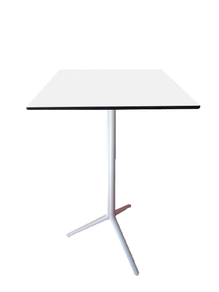 Pied en alu anodisé et époxy blanc. Plateau rond ou carré stratifié blanc. Plateau rabattable.