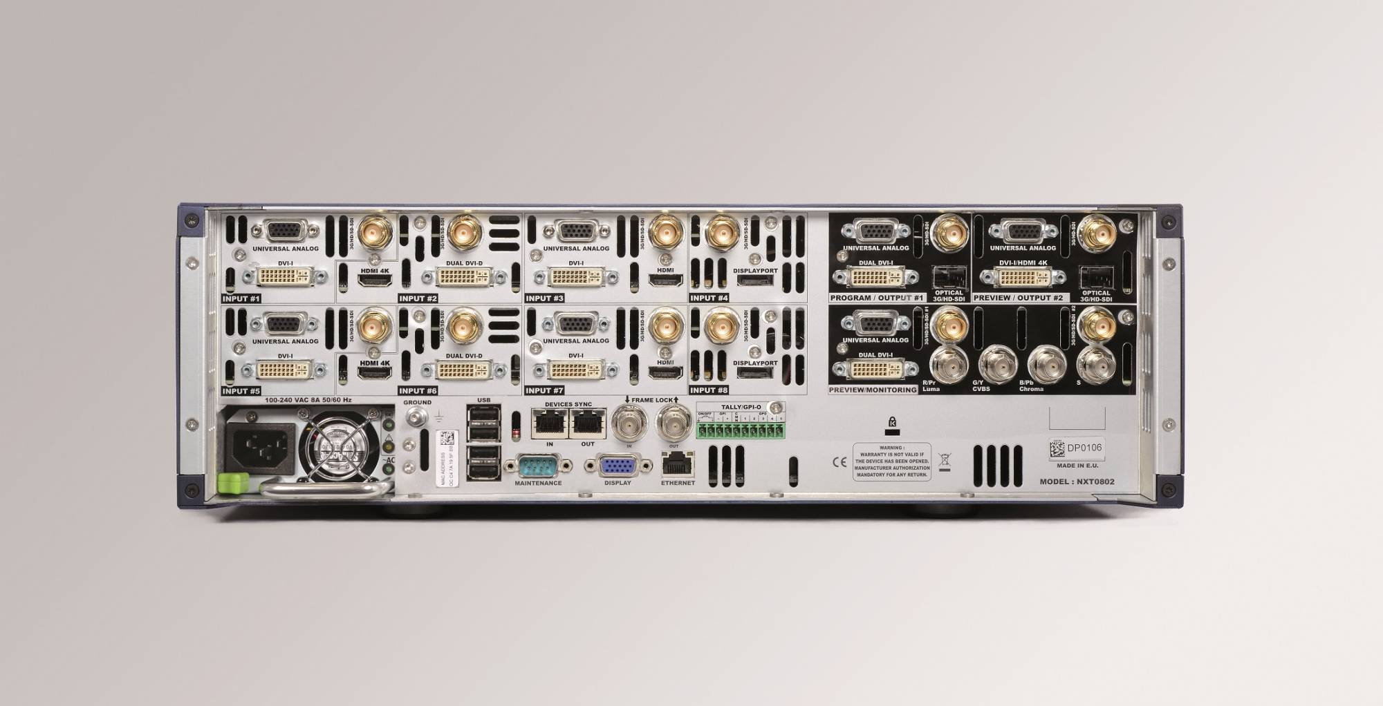 Listing des entrées : 4 entrées HDMI (avec notamment 2 entrées HDMI 4K), 6 entrées DVI-I, 2 entrées DISPLAY PORT, 8 entrées 3G HD SD-SDI, 8 entrées universelles analogiques.